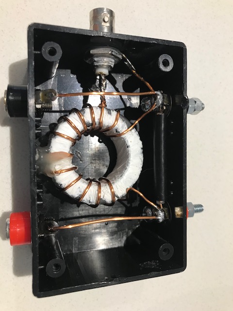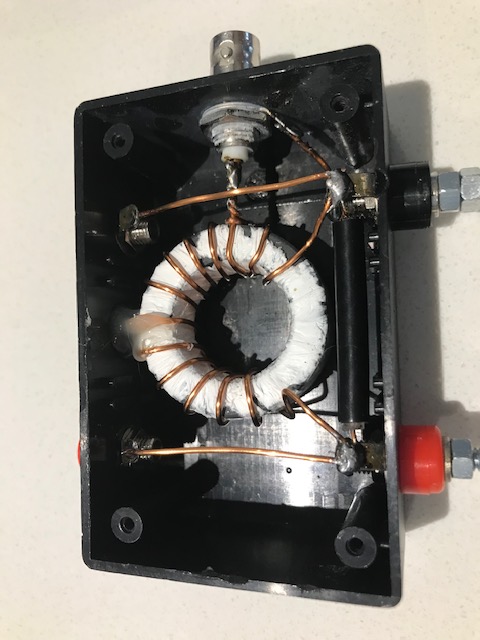 I suspect my toroid (found in a junk box) wasn’t a T200-2 as recommended but it tuned up fine, and as a result the coaxial capacitor was short enough to fit inside the project box (bonus).
