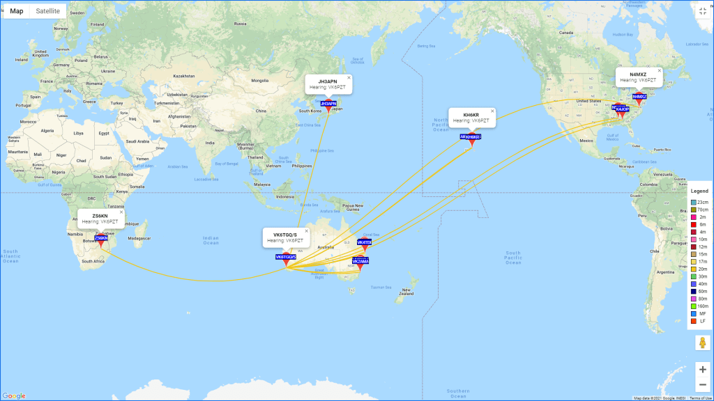 I also gave WSPR a go, having never used it previously. Not being familiar with the WSPR mode, I thought my luck had run out, as I could not see the results within WSJT-X ….. turned out I was wrong. The following morning, I received an email from Brian VK6TGQ complimenting me on how successful I had been on WSPR! The screen shot he sent to me is included below.